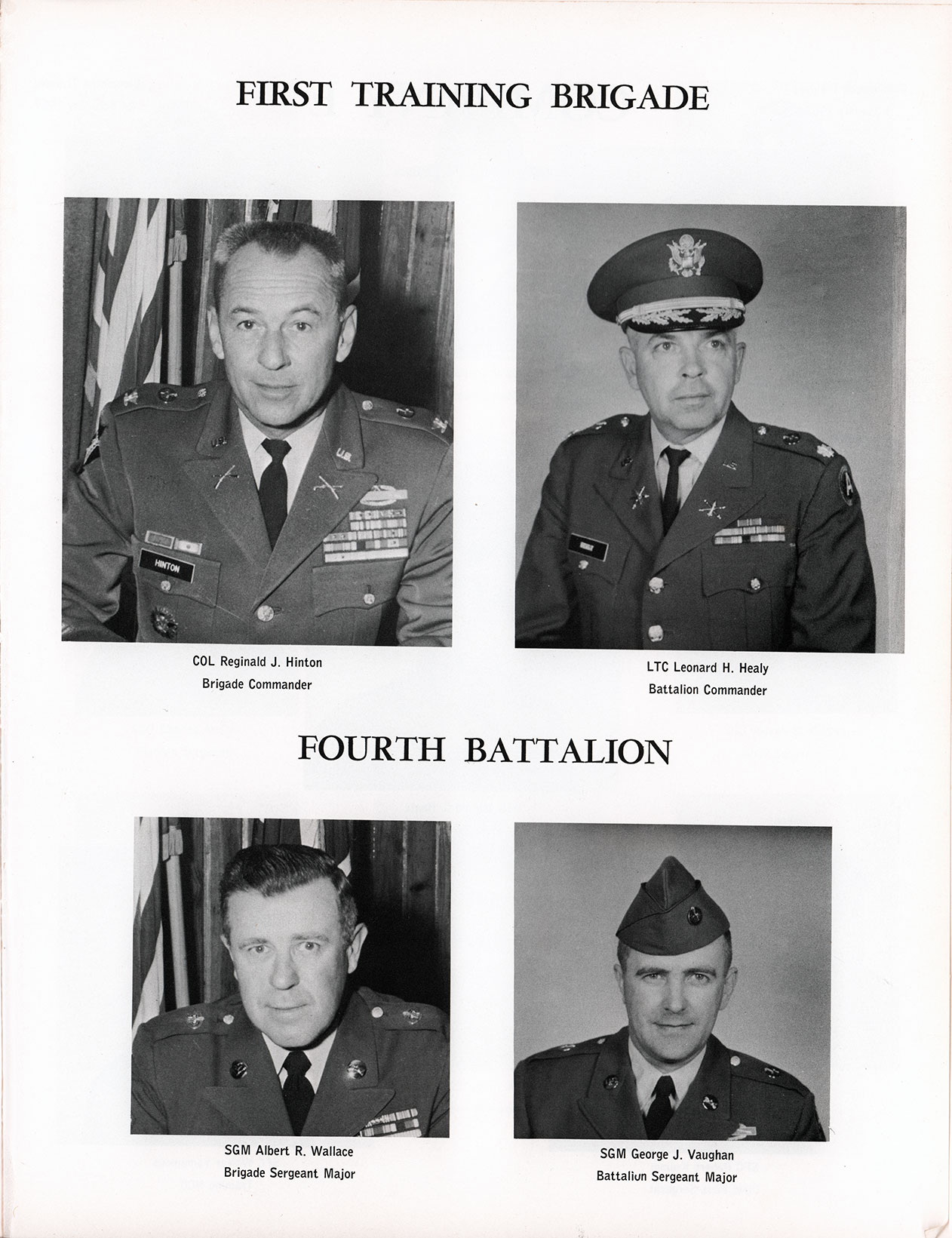 Company E, 4th BTN, 1st Training Brigade 1967 Fort Campbell Basic Training Leadership, Page 1. Portrait Phots Include: COL Reginald J. Hinton, LTC Leonard H. Healy, SGM Albert R. Wallace, and SGM George J. Vaughan. | GGA Image ID # 23160ea7fe. Click to View a Larger Image.