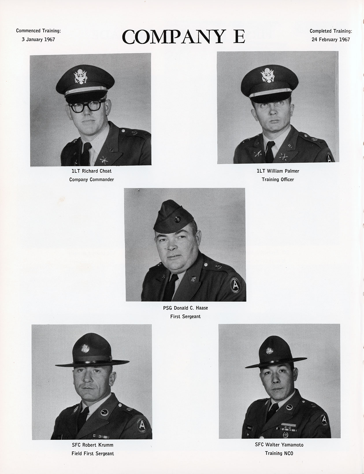 Company E, 4th BTN, 1st Training Brigade 1967 Fort Campbell Basic Training Leadership, Page 2. Portrait Photos Included: 1LT Richard Choat, 1LT William Palmer, PSG Donald C. Haase, SFC Robert Krumm, and SFC Walter Yamamoto. | GGA Image ID # 2316804deb. Click to View a Larger Image.