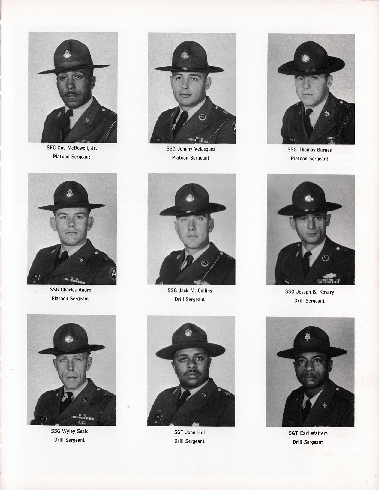 Company E, 4th BTN, 1st Training Brigade 1967 Fort Campbell Basic Training Leadership, Page 3. Portrait Photos Included: SFC Gus McDowell, Jr., SSG Johnny Velasquez, SSG Thomas Barnes, SSG Charles Andre, SSG Jack M. Collins, SSG Joseph B. Kovary, SSG Wyley Seals, SGT John Hill, and SGT Earl Walters. | GGA Image ID # 2316af187f. Click to View a Larger Image.