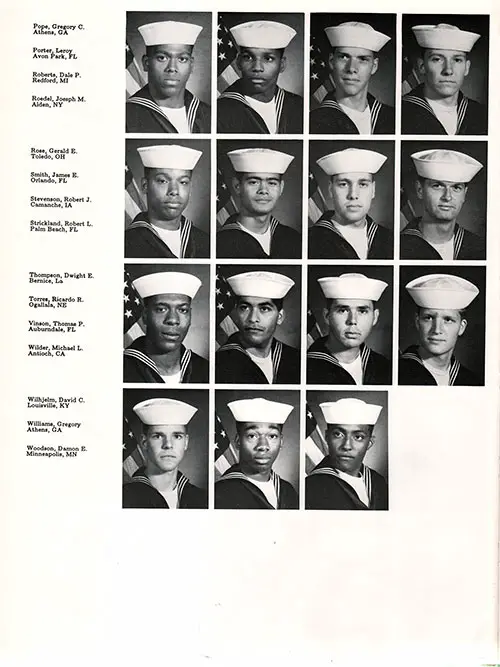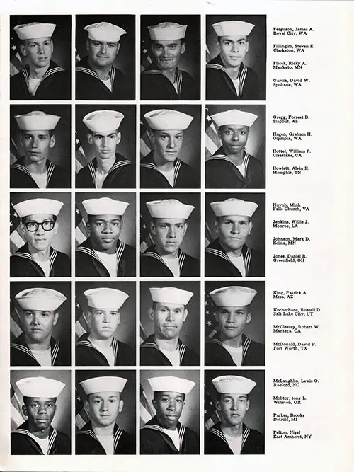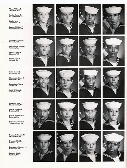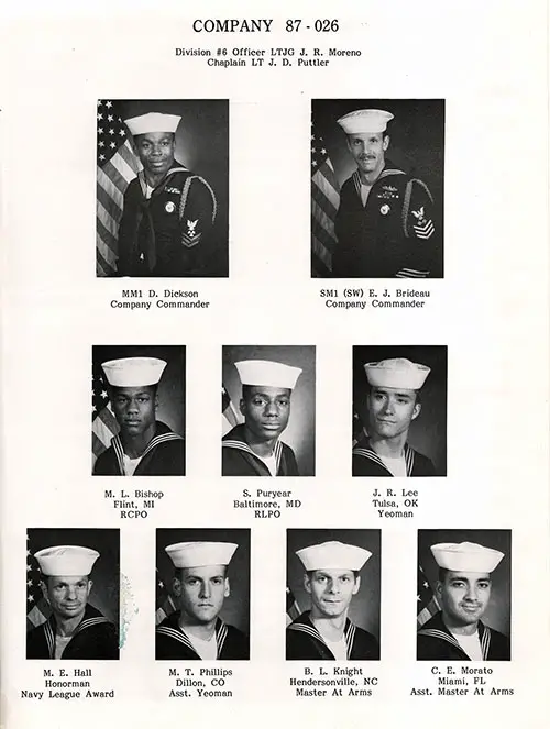 Roster and Photos for Recruit Company 026 for 1987, United States Naval Training Center, San Diego, California. Company Commanders: MM1 D. Dickson and SM1 (SW) E. J. Brideau. 62 Men Graduated. Training Dates Not Reported.