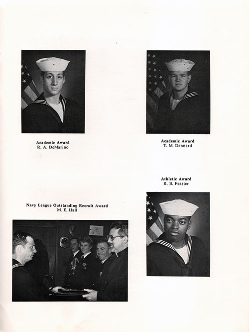 Company 87-026 Honors, Page 6 - Clockwise: Academic Award - R. A. DeMarino; Academic Award - T. M. Dennard; Athletic Award - R. B. Feaster; Navy League Outstanding Recruit Award - M. E. Hall